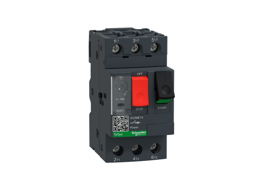 TeSys GV motor circuit breaker, 3 poles (3P), 10A/690V, for 3-phase motor applications 3-4kW@400V. It provides a thermal-magnetic protection with a thermal setting range 6-10A, magnetic tripping at 13xIn, high breaking capacity Icu 100kA@400V. Connection by screw clamp terminals. Start-stop control by push-button guaranteed for 100,000 cycles AC-3. Multi standards certified (IEC, UL, CSA, CCC, EAC, Marine, ATEX), Green Premium compliant (RoHS/REACh).