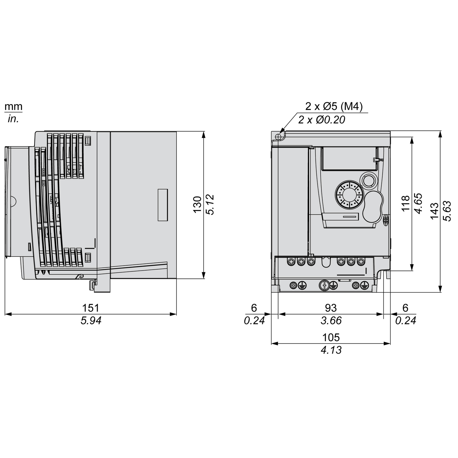 This Easy Altivar 310 drive is a frequency inverter for three-phase asynchronous motors. Its protection index is IP20. It works at a rated power up to 2.2kW/3HP, and a rated voltage from 380V to 460V AC. Its compact size, robust design, and ease of installation, based on the principle of plug and play, and its integrated functions make it particularly suitable for applications involving industrial machines and certain consumer machines. It offers high readability of key parameters thanks to a bright LED 4-digit display. Underload and overload detection help to protect your installation. It weighs 1.1kg and its dimensions are 105mm wide, 143mm high, and 151mm deep. This drive incorporates functions that are suitable for the most common applications, including textile machines, machine tools, wood-making machines, material handling, packaging and printing machines, and ceramic machines.